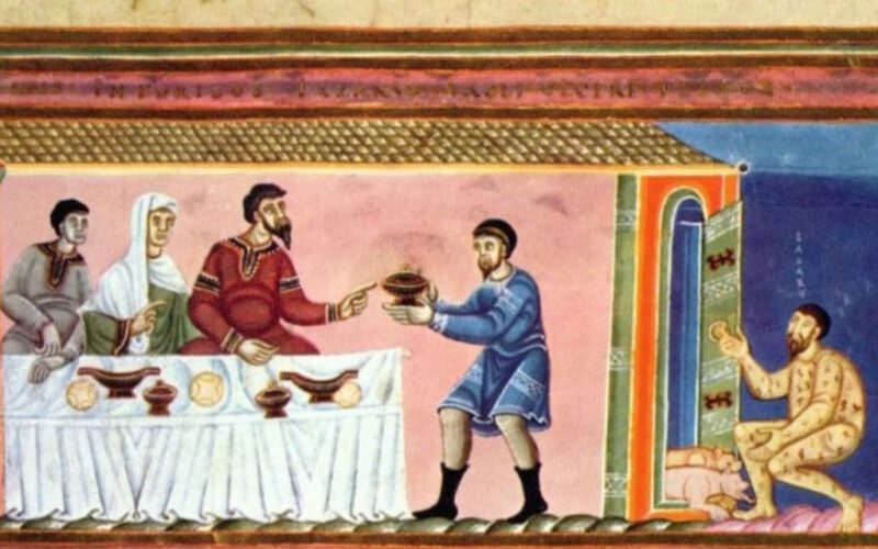 Żył pewien człowiek bogaty, który ubierał się w purpurę i bisior i dzień w dzień ucztował wystawnie. U bramy jego pałacu leżał żebrak pokryty wrzodami, imieniem Łazarz. Pragnął on nasycić...